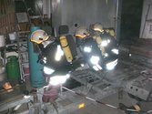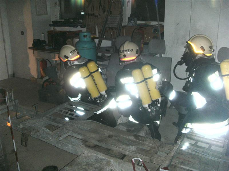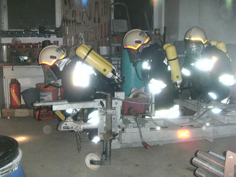 Übungsannahme war: Ein Fahrzeugbrand in der Fahrzeughalle mit einer vermissten Person und einigen Gasflaschen, dazu der ausfall einiger Hydranten!