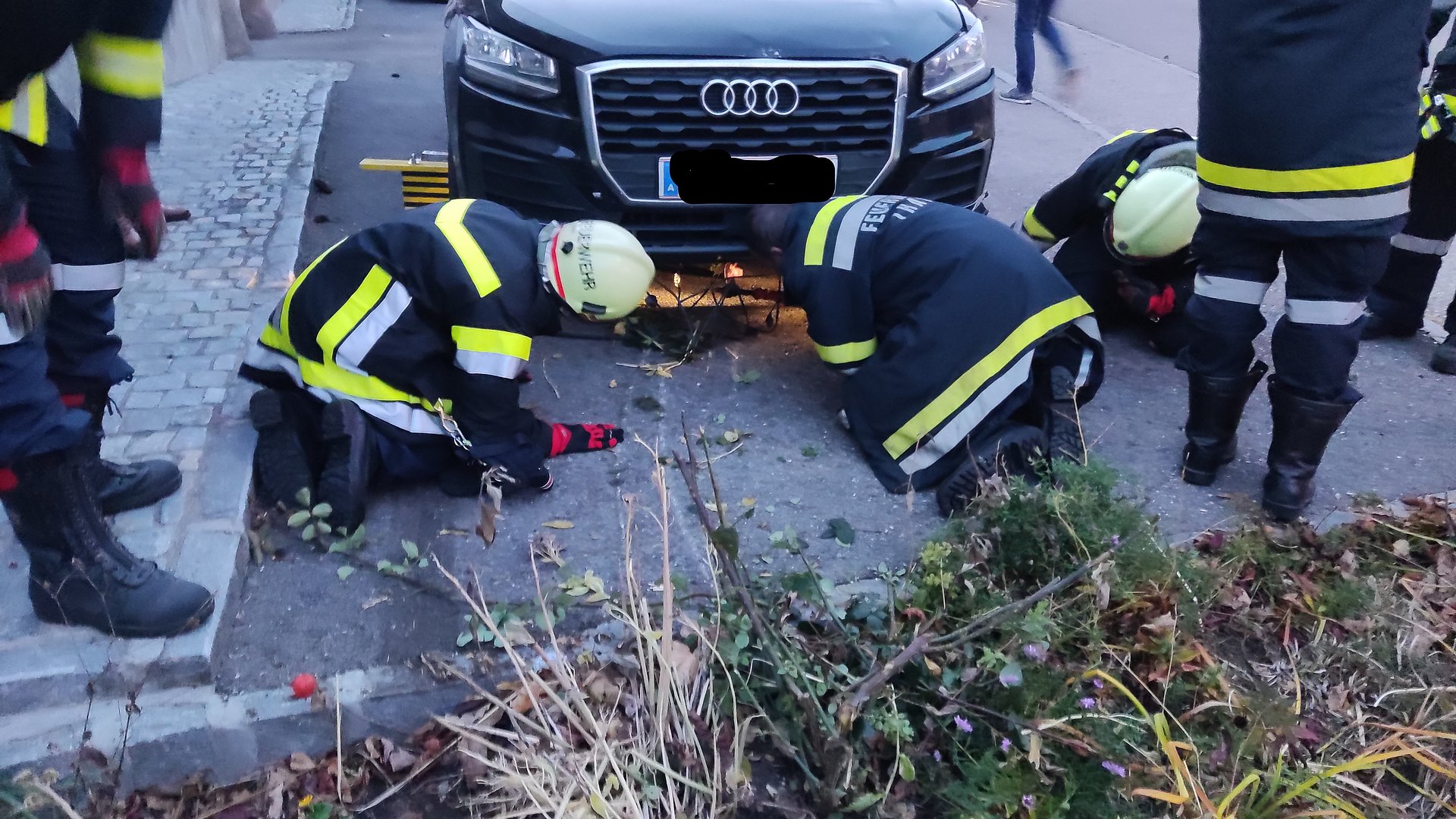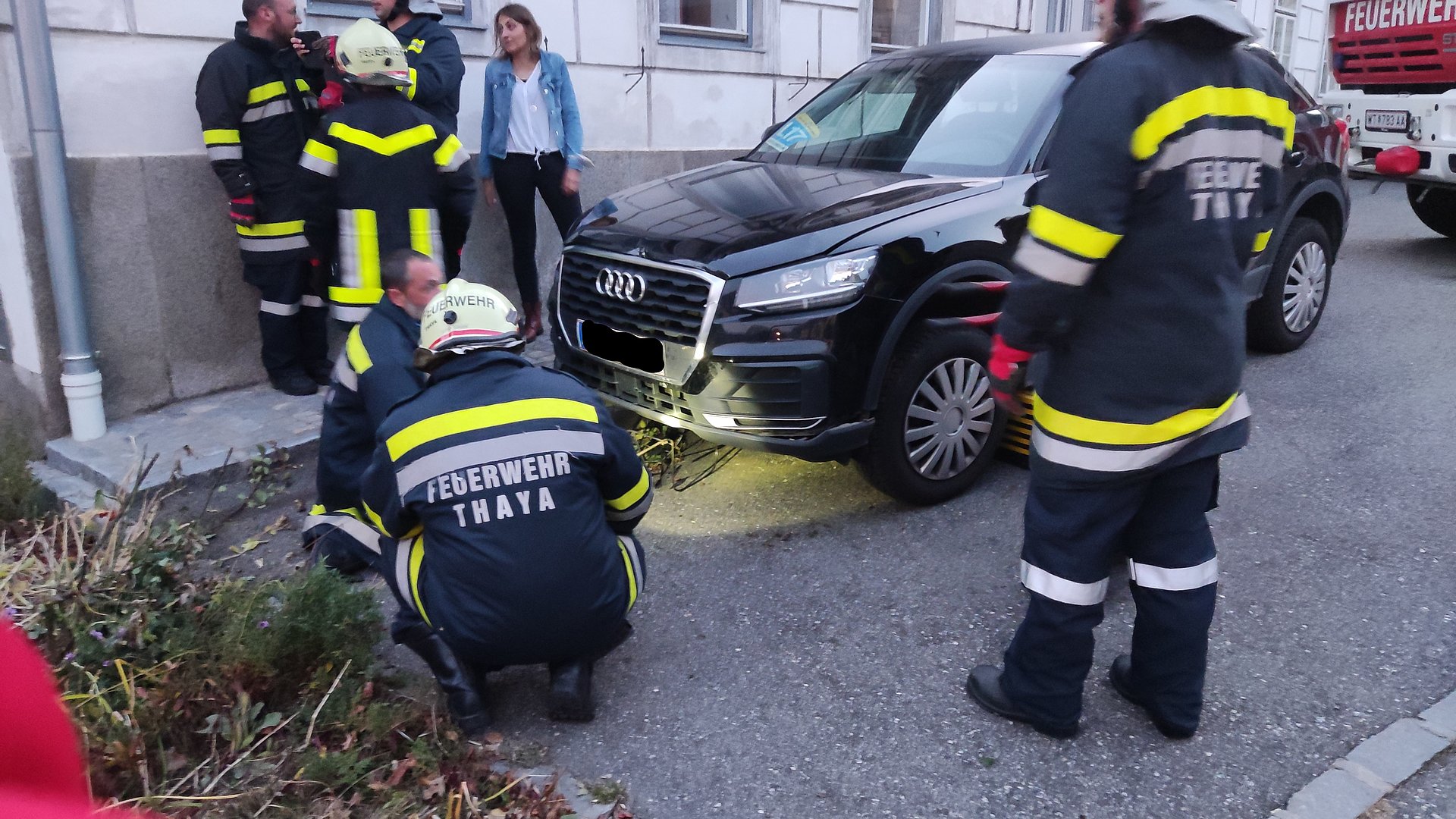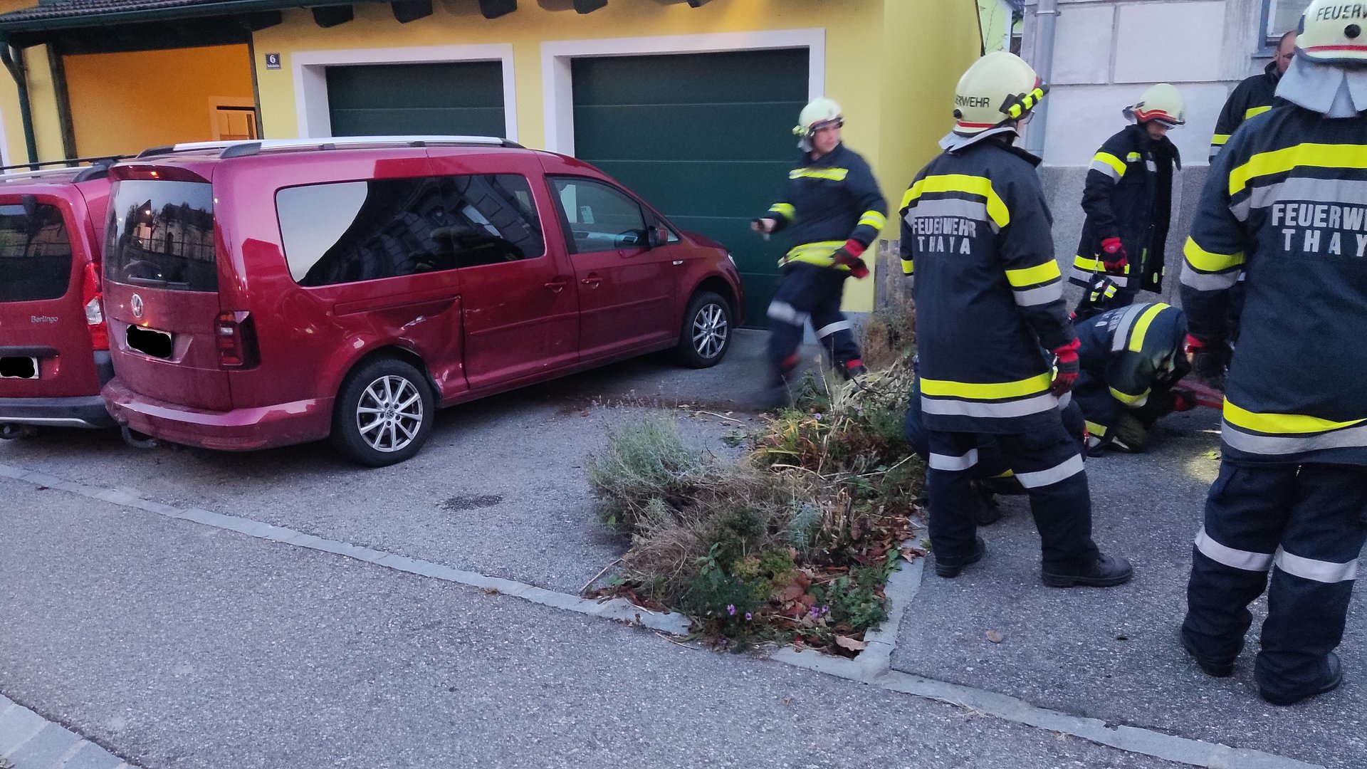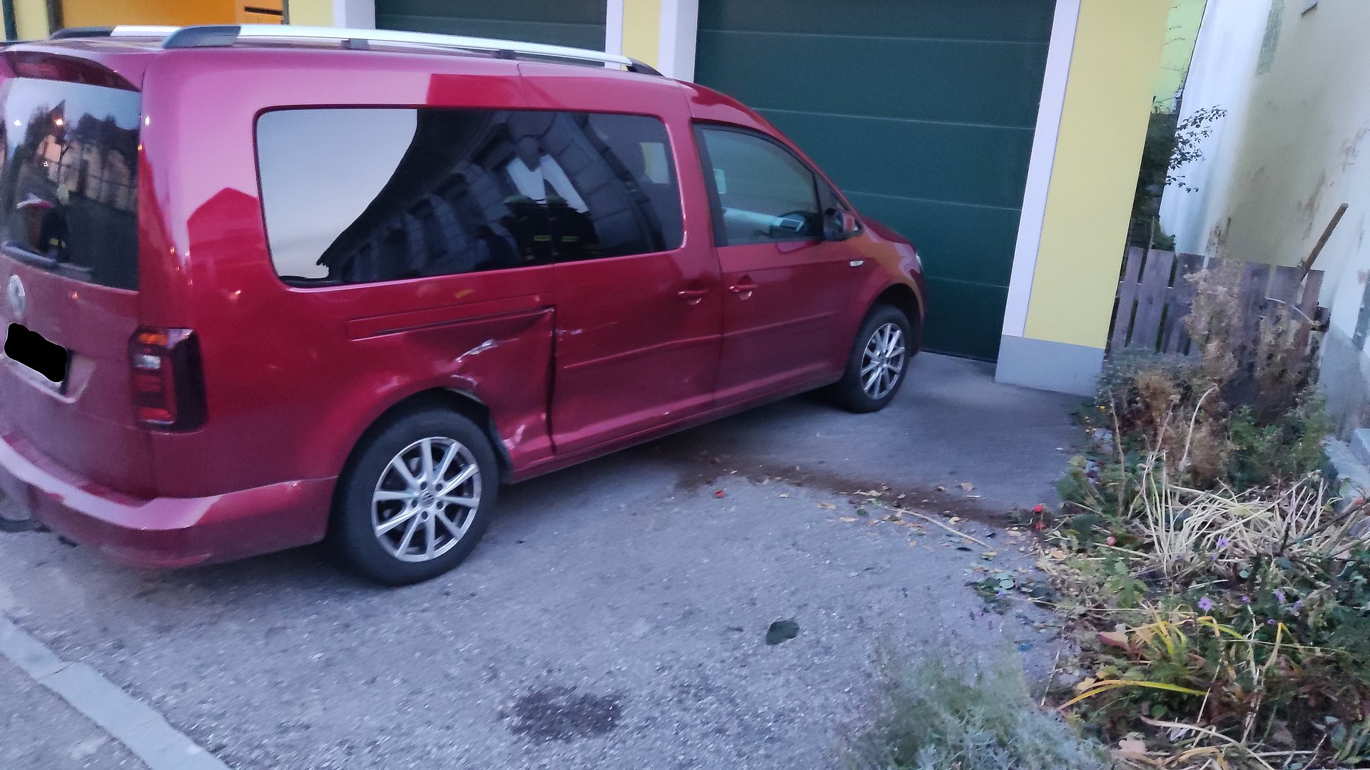 Ein geparktes Fahrzeug, das auf einen etwas schrägen Parkplatz platziert war, setzt sich selbstständig in Bewegung. Es fuhr in zwei andere geparkte Autos und schob sie zusammen.