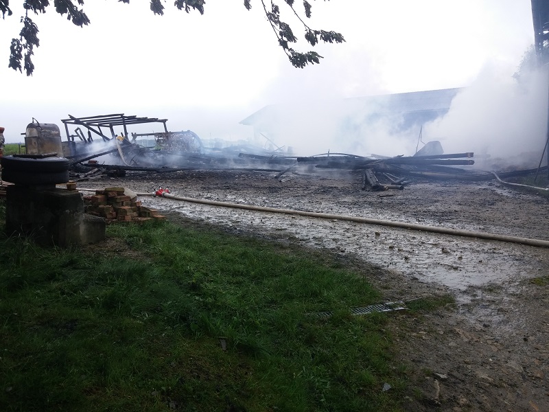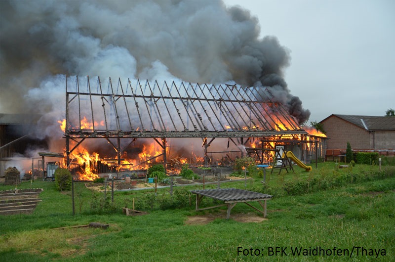 Kurz vor 11 Uhr wurde von der Landeswarnzentrale Niederösterreich Großalarm ausgelöst. Eine Scheune eines landwirtschaftlichen Anwesens stand beim Eintreffen der ersten Löschkräfte bereits in Vollbrand. Der Brand hatte auf ein weiteres Wirtschaftgebäude, in dem 15 Milchkühe untergebracht sind, übergegriffen. Der Einsatzleiter forderte sofort weitere Feuerwehren aus der Umgebung an. Die Besitzerin erlitt einen Schock und musste vom Roten Kreuz versorgt werden. Ein Feuerwehrmann musste wegen Kreislaufschwäche ebenfalls versorgt werden.
