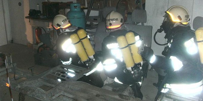Bei der Anfahrt zum Einsatzort, rüstete sich bereits ein Atemschutztrupp aus, um bei Eintreffen rasches Eindringen ins innere des Gebäude zu ermöglichen.