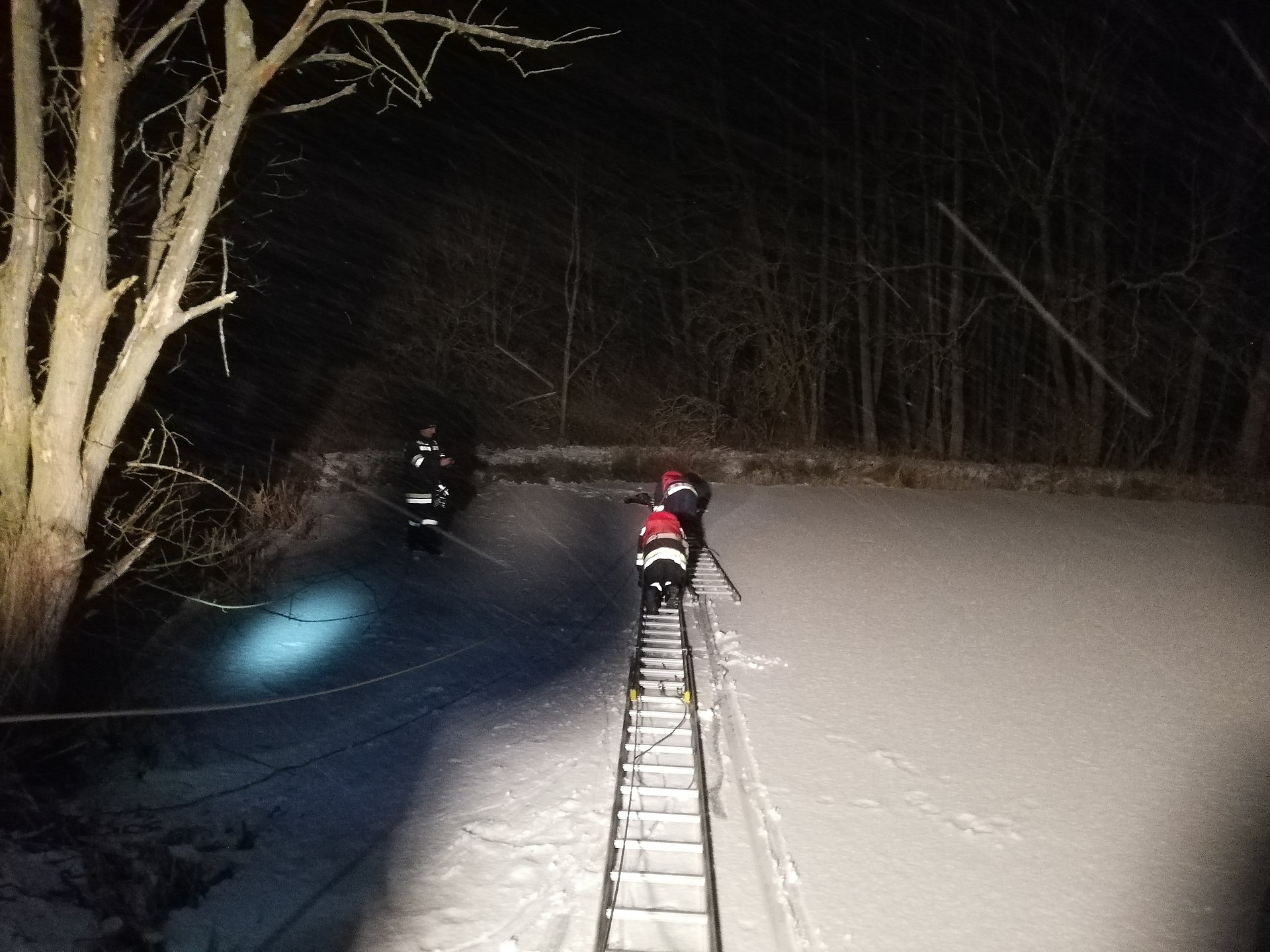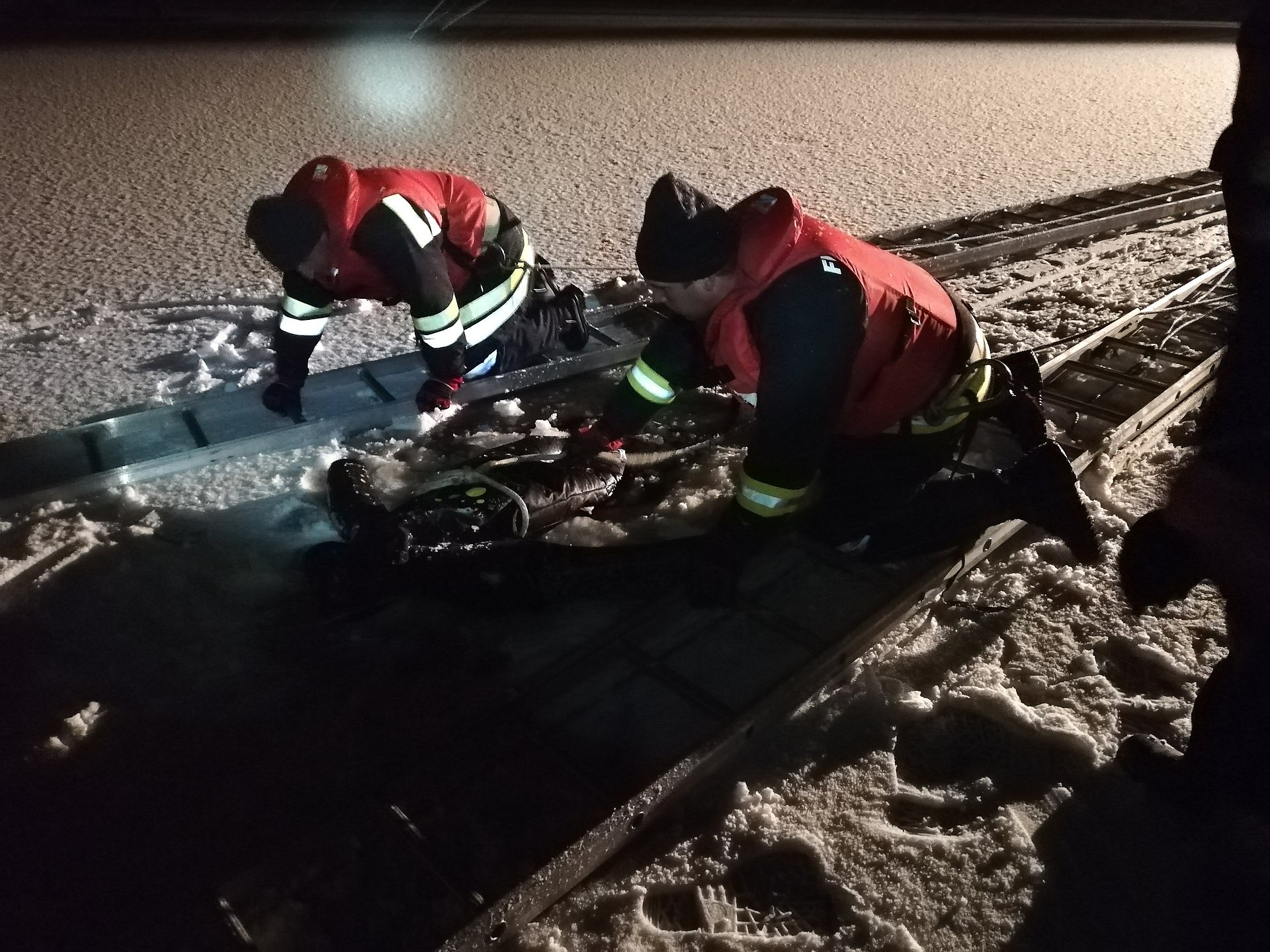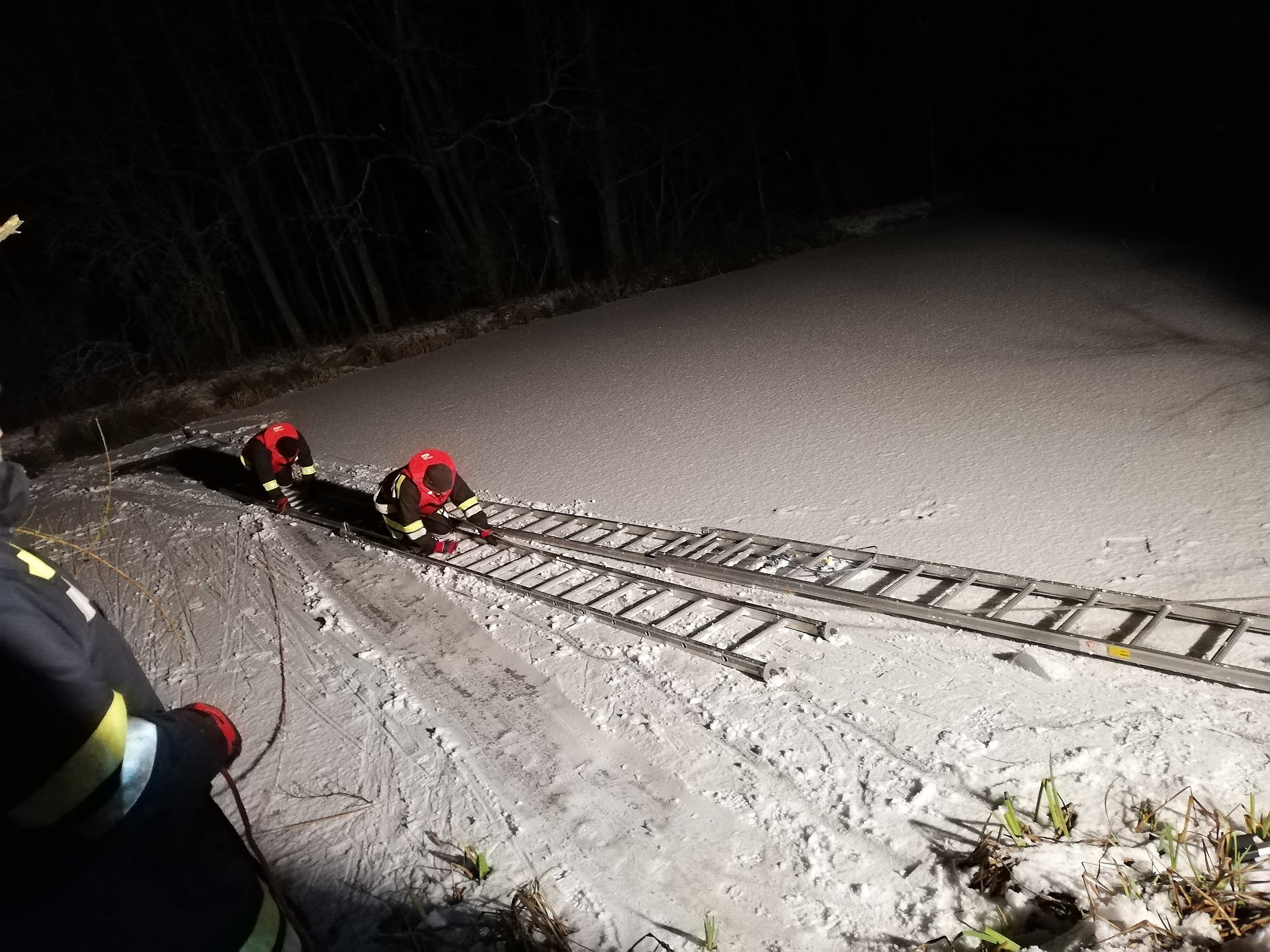 Nach dem Sichern der Leitern begaben sich zwei Mann auf das Eis und Retteten die eingebrochene Person. Die restliche Mannschaft sicherte die Leitern und die zwei Mann auf dem Eis.