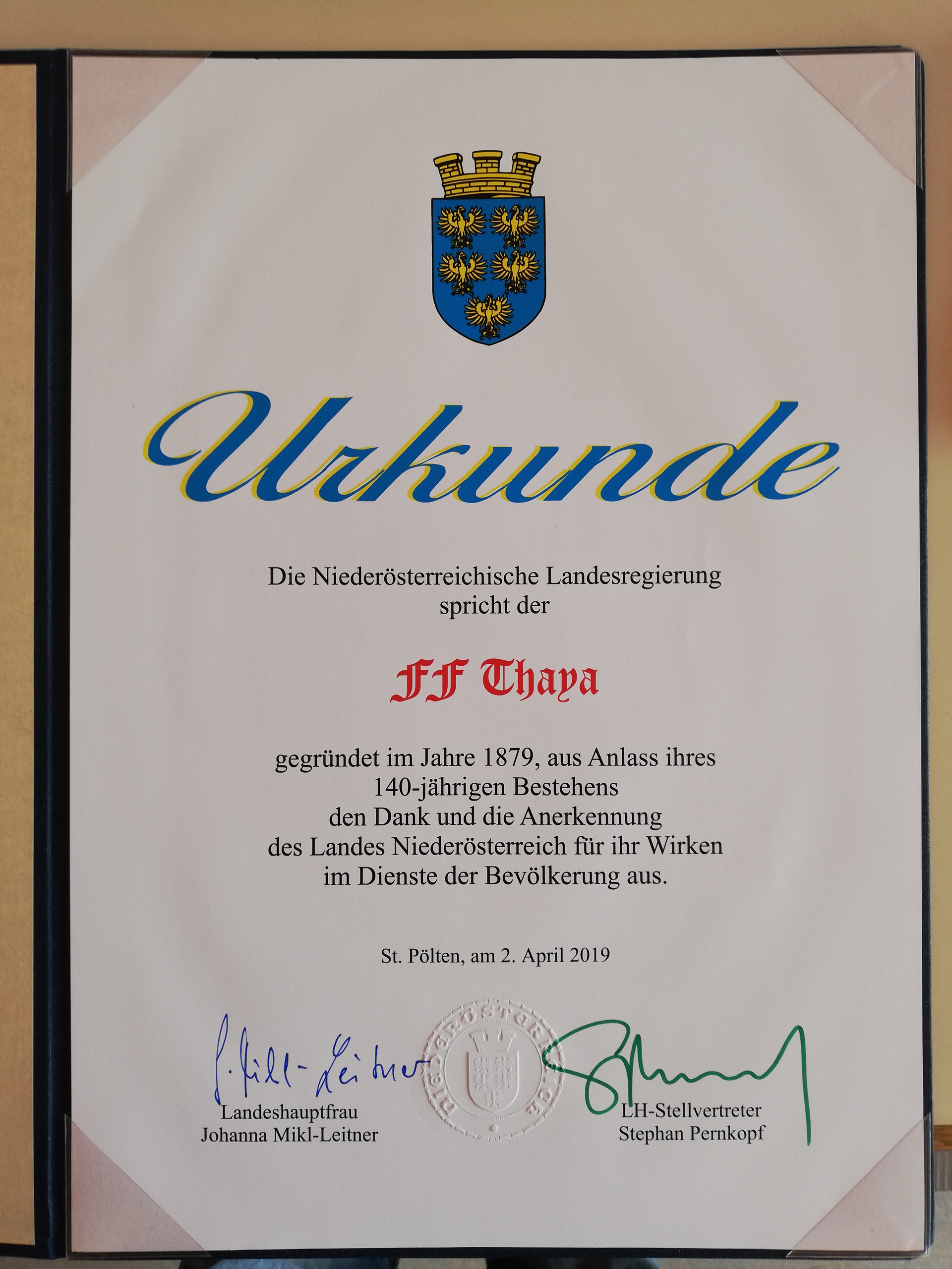 Aus diesem Anlass wurde an die Freiwillige Feuerwehr Thaya eine Jubiläumsurkunde überreicht, die von Vizibürgermeister Franz Strohmer, Kommandant Mag. Andreas Ullrich und dem Leiter des Verwaltungsdienstes Reinhold Litschauer entgegengenommen wurde.