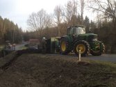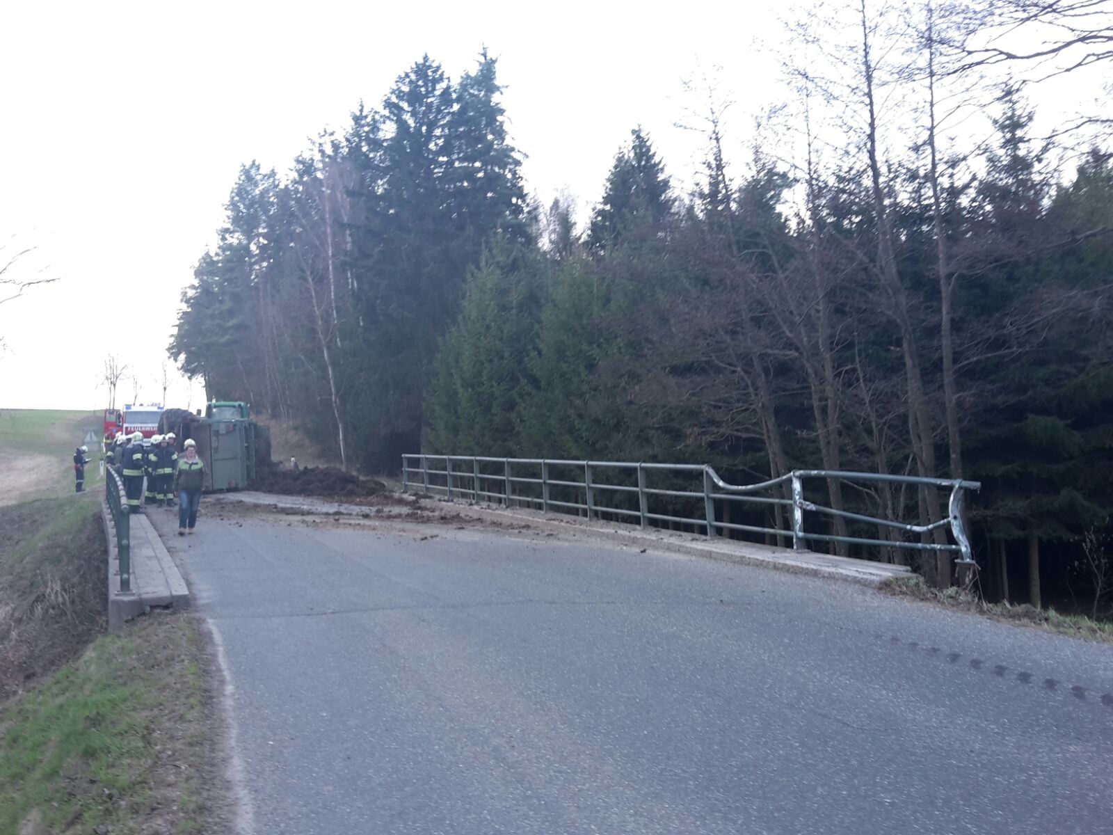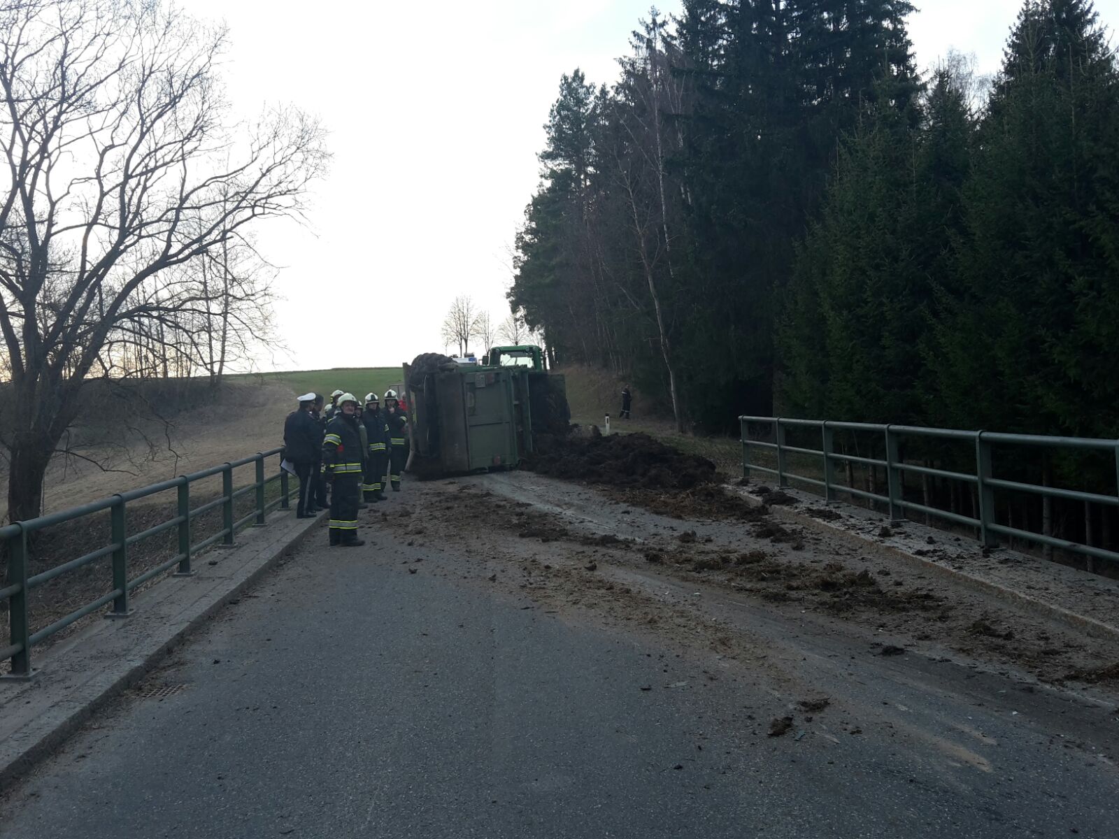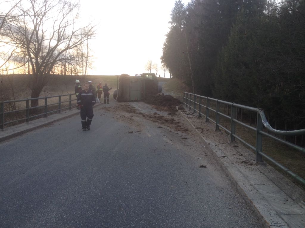 Auf der L63 zwischen Eggmanns und Frühwärts war es zu einem Verkehrsunfall mit einem Traktor gekommen, wobei der mit Mist beladene Anhänger umstürzte.