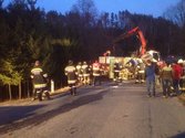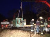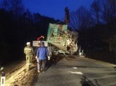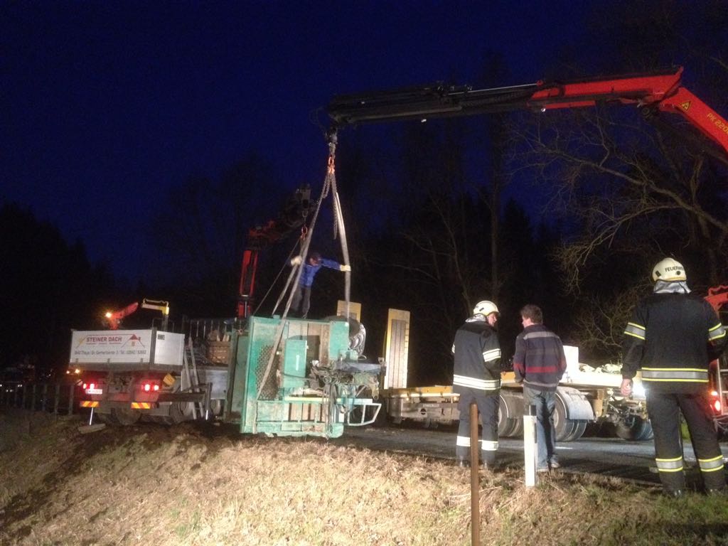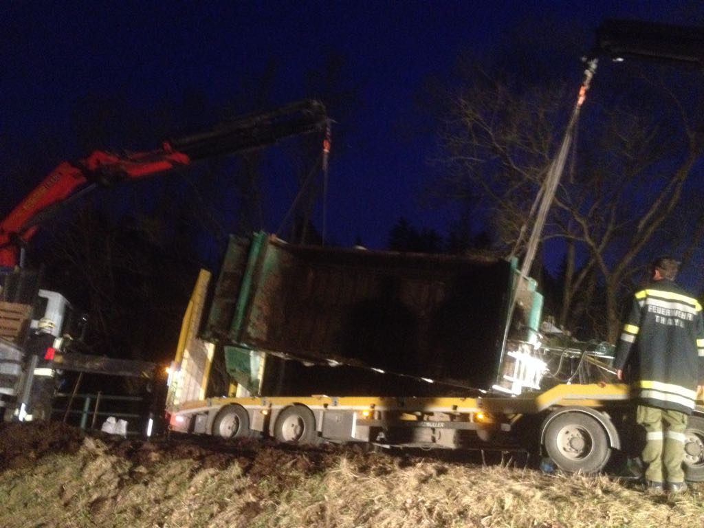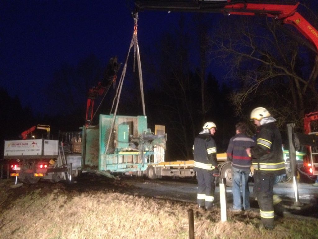 Dieser wurde entladen und mit Hilfe eines Kranwagens auf einen Tieflader gehoben und abtransportiert.