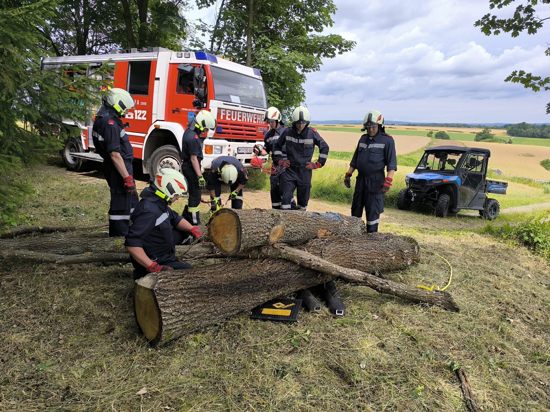 Simuliert wurde hier ein Forstunfall, ausgelöst durch einen rollendgewordenen Holzstapel. Mittels Hebekissen, Unterbaumaterial und Muskelkraft wurden die Holzstämme vom verletzten entfernt.