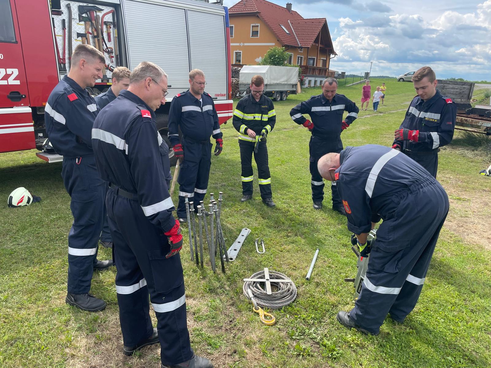 Start dieser Station war in der Fahrzeughalle des Feuerwehrhauses, dort wurden alle Anschlagmittel besprochen, welche wir in der Feuerwehr besitzen. Nach dieser kurzen Gerätevorstellung ging es schon zum Übungsgelände auf einer Wiese in Thaya.